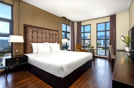 The most luxurious Sanouva Excutive offers an ultimate experience of space. While still having comfort of two bedrooms; one of the bedrooms has a king size bed and the other is furnished with two twin beds; separate living room with sofa for up to 6 people and window with city view, private in-room kitchen, 2 bathrooms and Verde Jade marble bathroom with bathtub and walk-in shower. |